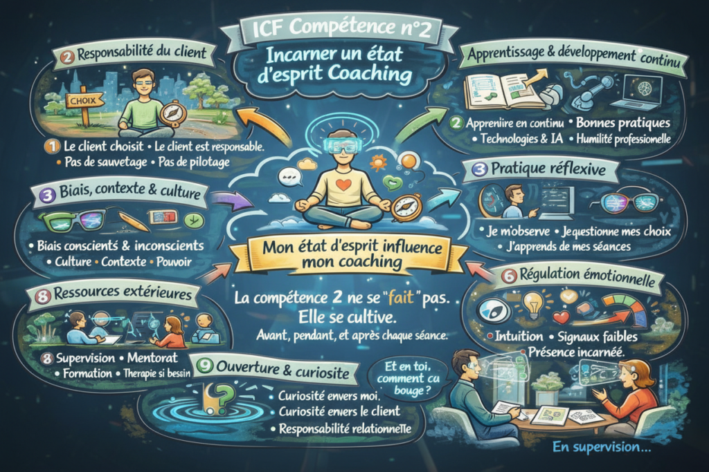 Ces artefacts décrivent deux compétences fondamentales requises pour l’obtention de la certification de l’International Coaching Federation (ICF). La Compétence 1 met l’accent sur la nécessité de faire preuve d’une pratique éthique, exigeant une solide connaissance et une adhésion constante au code de déontologie de l’ICF. Elle définit les comportements conformes, comme le maintien du rôle de coach et l’utilisation de compétences clés, tout en énumérant les comportements non conformes, tels que l’adoption d’un mode conseil ou thérapeutique. La Compétence 2 se concentre sur l’adoption d’une attitude de coaching impliquant un état d’esprit ouvert, curieux et centré sur le client. Cette seconde compétence est présentée comme un processus continu d’apprentissage et de développement personnel et professionnel, évalué lors de l’examen d’accréditation.